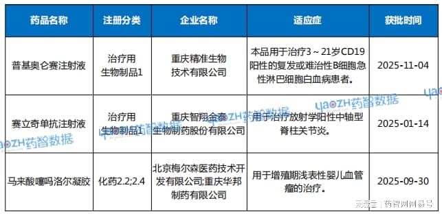 表1 2025年,重庆市获批的新药品种
