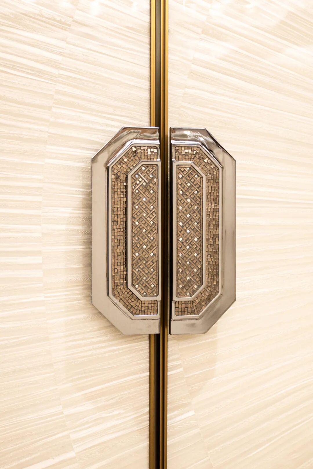 ART DECO风格的黑白拼花大理石地面与大面积镜面墙设计,延展了入户空间的视觉深度。如璀璨星环水晶环形吊灯,增添了归家的仪式感。奢华的玉石背景墙与法式经典家具相映生辉,在静谧与华美之间,彰显翡梵空间的非凡气度。餐厅与西厨之间,八扇手工定制的电动旋转立门,宛如天工造物般的巧思令人惊艳。每一扇门均镶嵌意大利SICIS内含铂金的奢华马赛克,天然贝壳面板在灯光下折射出璀璨光芒。门扇的开合间,实现了空间的灵动转换,私密与开放的完美平衡,为社交与生活增添无限乐趣。每一处细节都经过大师级的匠心打磨,呈现出一场视觉与感官的极致盛宴