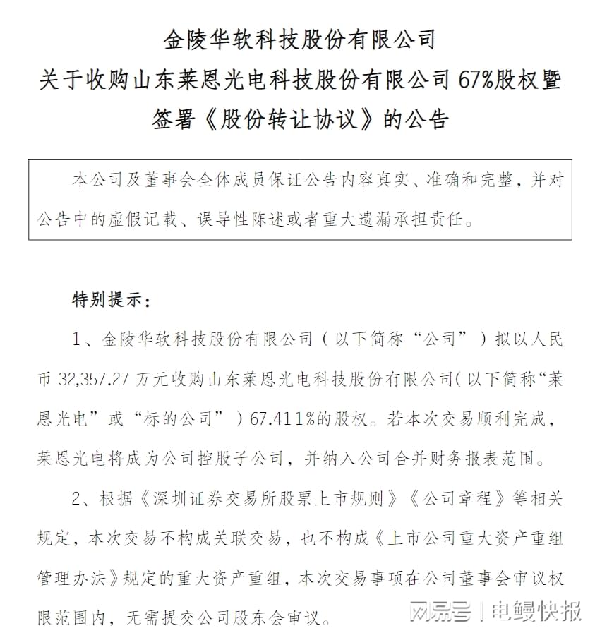 3月6日,华软科技发布公告披露,公司拟以人民币3.24亿元收购山东莱恩光电科技股份有限公司(以下简称莱恩光电或标的公司)的67.411%股权。若本次交易顺利完成,莱恩光电将成为华软科技控股子公司,并纳入公司合并财务报表范围。