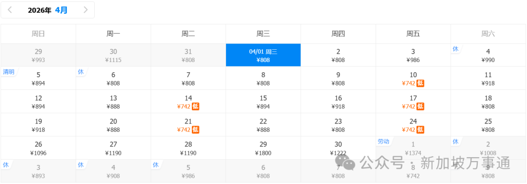 除了以上航司优惠活动外,万事通还和大家分享一下,从中国35城市飞新加坡的航班4月份的机票!