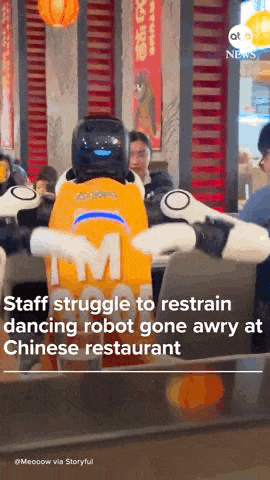而日前,美国加州一家海底捞连锁餐厅所引进的一台国产机器人,因在给食客表演中,忽然发疯,砸碗敲桌,面对三个人压制,也停不下来的视频,全网爆红,被网友戏称最像打工人暴走的一集……