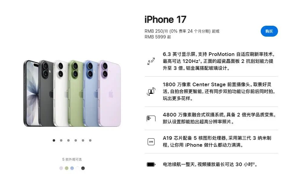 苹果官方发布的价格,iPhone17为5999元。