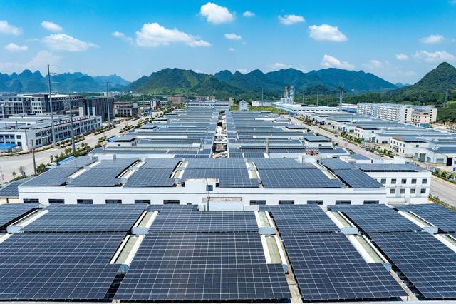2025年7月27日,广西桂林,平乐县二塘镇工业集中区东区标准厂房屋顶,太阳能光伏板整齐排列,被阳光映照得呈现深蓝色调。