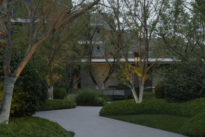 透过会所泳池落地玻璃幕墙向庭院观望,高挑近7m的悬空茶室彷佛静卧于林叶之上,其灵感汲取《秋林图》“停驻、石台”手法的隐逸美学。以现代笔法重构山林之形,深色质感景墙起伏交错,与山形立面底部、半山、顶部皆布置成个性游园场所,极简又兼具东方格局的艺术景亭与生态植物构成对话,水流、灯光与材质细节共筑沉浸体验。
