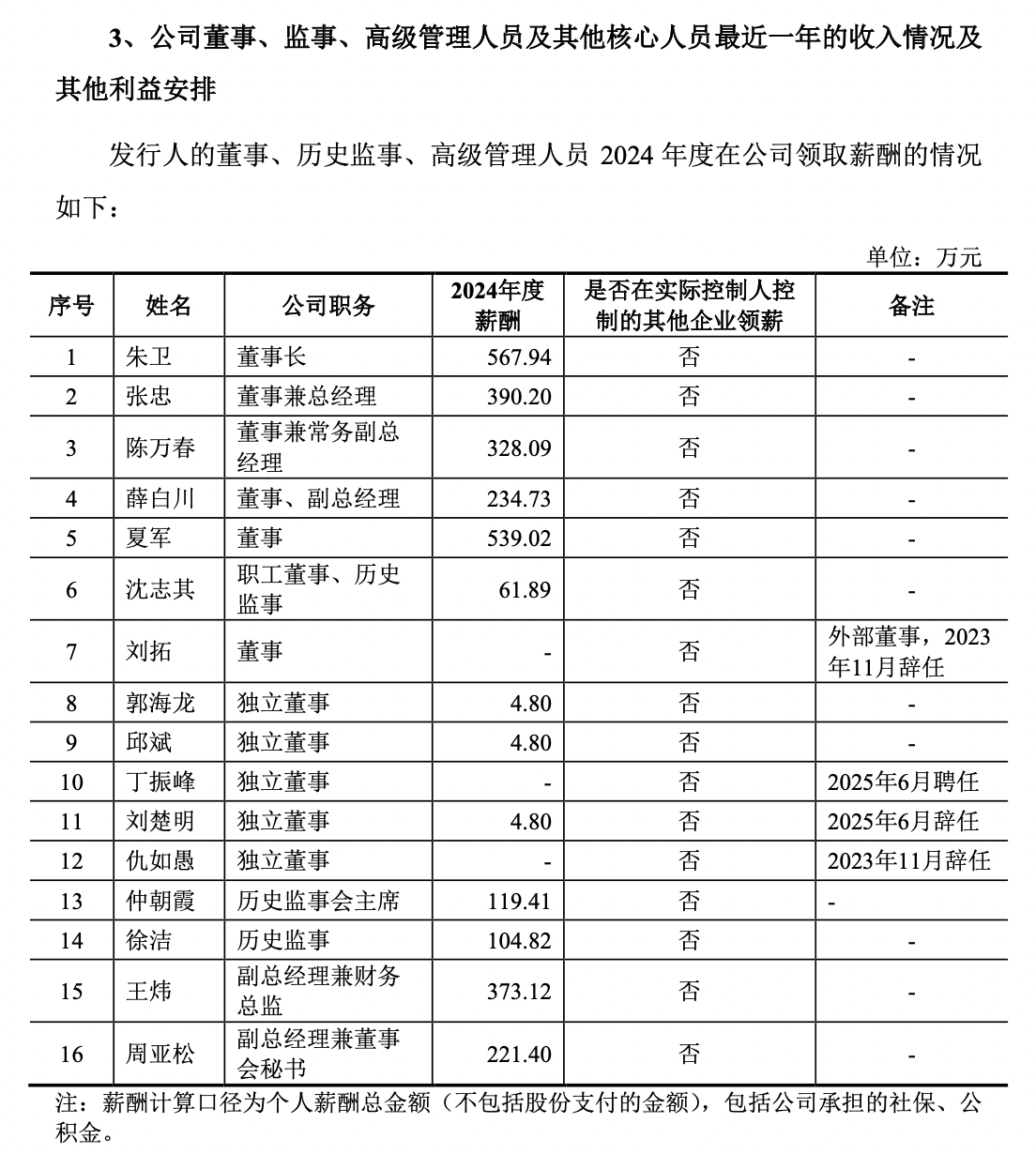 薪酬方面,2024年,董事长朱卫的年薪为567.94万元,而副总经理兼董事会秘书周亚松的年薪为221.4万元。