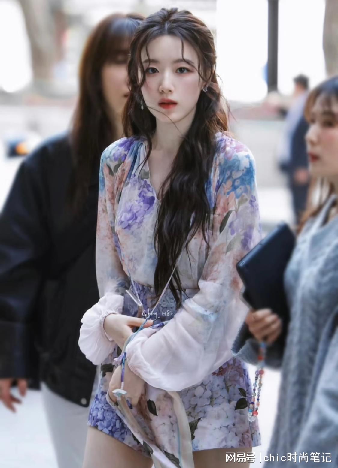 雪纺面料得碎花上衣搭配同系列碎花短裤,很有春夏色感的一套look,有一种油画似的的繁复美,搭配卷发和清新妆容,氛围感美女拿捏。
