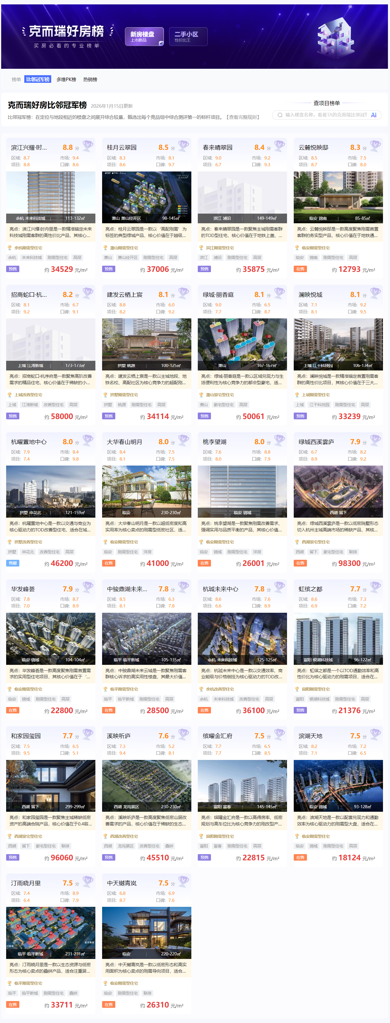 克而瑞好房点评网的“比邻冠军榜”采用“相邻对标、圈层聚焦”的逻辑,将地段、定位、价格相近的楼盘归入同一“竞品圈”进行公平PK。评选完全由AI驱动,基于20年房地产数据库,从四大维度、20余项指标进行量化评估,承诺“永不商业化、零人工干预”。