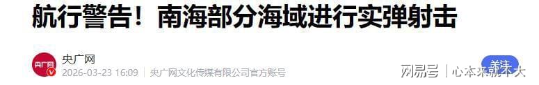 更有意思的是,镜头外还有另一条信息同步浮出水面,中国海事部门发布航行警告:3月24日至27日,南海部分海域连续4天实行实弹射击管制,每天8时到17时,禁止驶入。