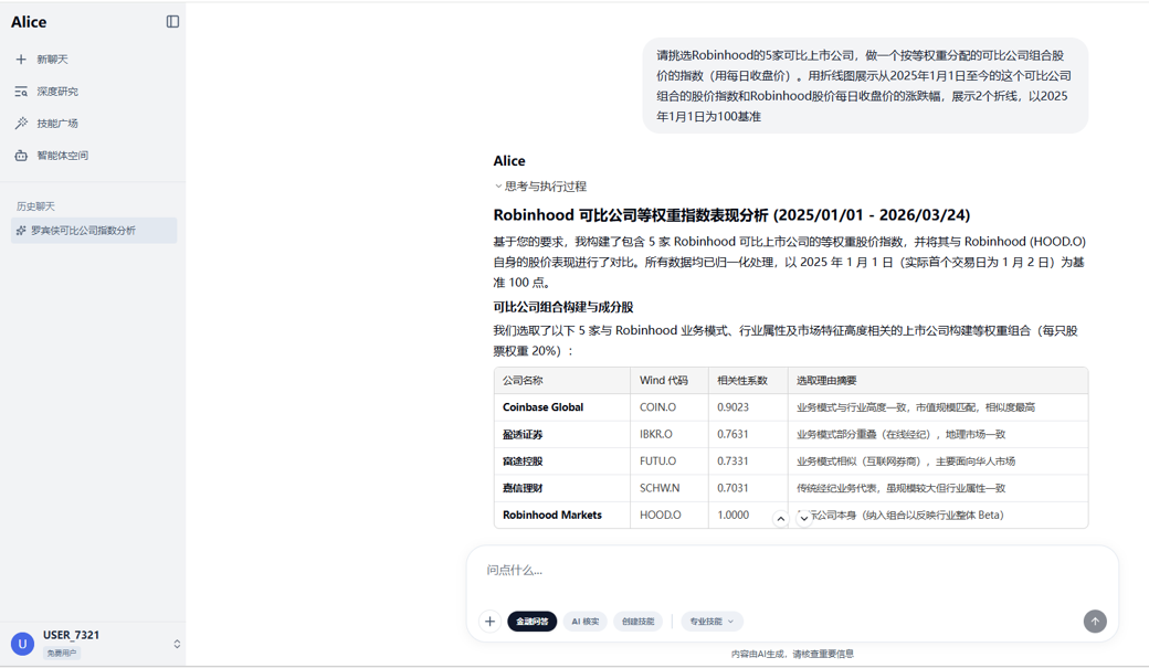 Wind Alice 会自动完成:可比公司筛选、样本解释、指数构建、基期归一、可视化输出,并把结论和图表一起交给你。