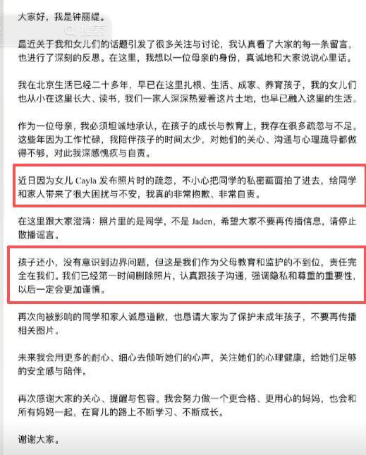 同时,钟丽缇也坦言自己因工作忙碌,在子女的教育与监护上存在很大疏忽,对此深感愧疚与自责,还向同学和其家人表达了歉意。