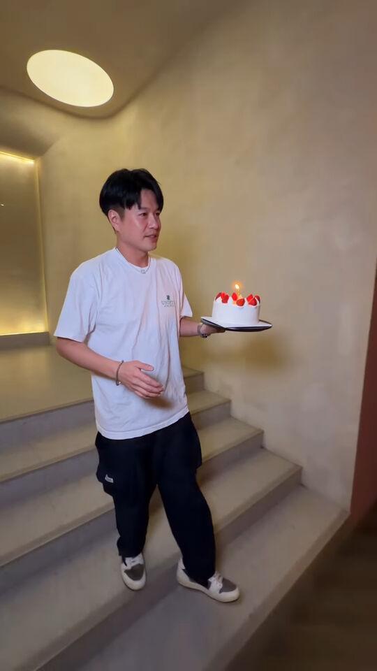 李易在社群发文并附上一段替六月庆生的影片,画面中只见他穿着白色短袖,双手端着一颗点燃蜡烛、铺满草莓生日蛋糕,弯下身子往前倾,并闭上双眼,深情地与六月啾嘴亲吻。一旁的六月,则是身穿一件红色连帽休闲上衣,微微仰起头,并双眼紧闭,整个人的身体微微向前倾,甜蜜地迎向老公的吻。