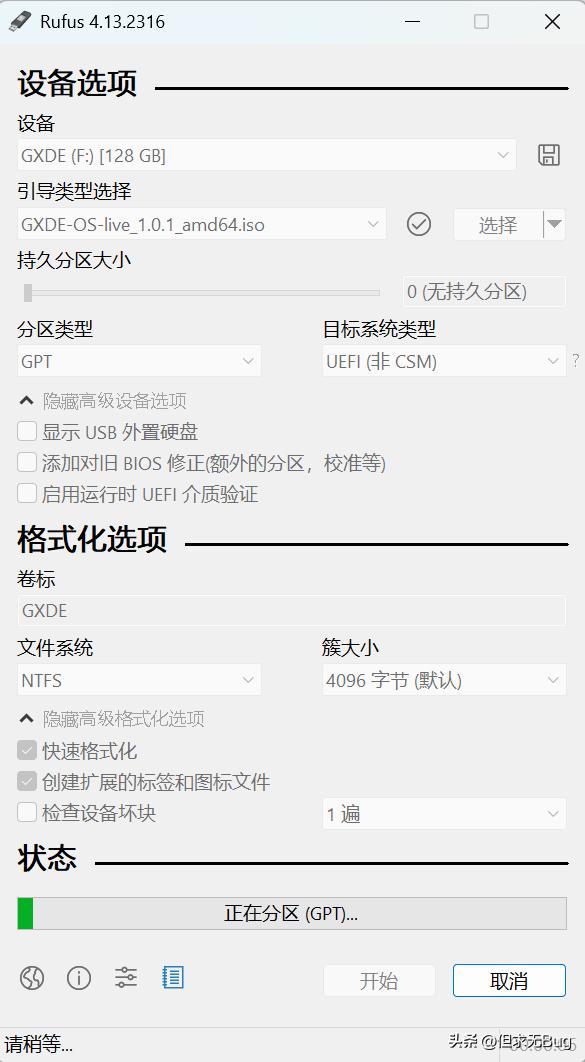 打开 Refus 后,选择刚才下载的镜像,并调整分区类型为:GPT,文件系统为 NTFS: