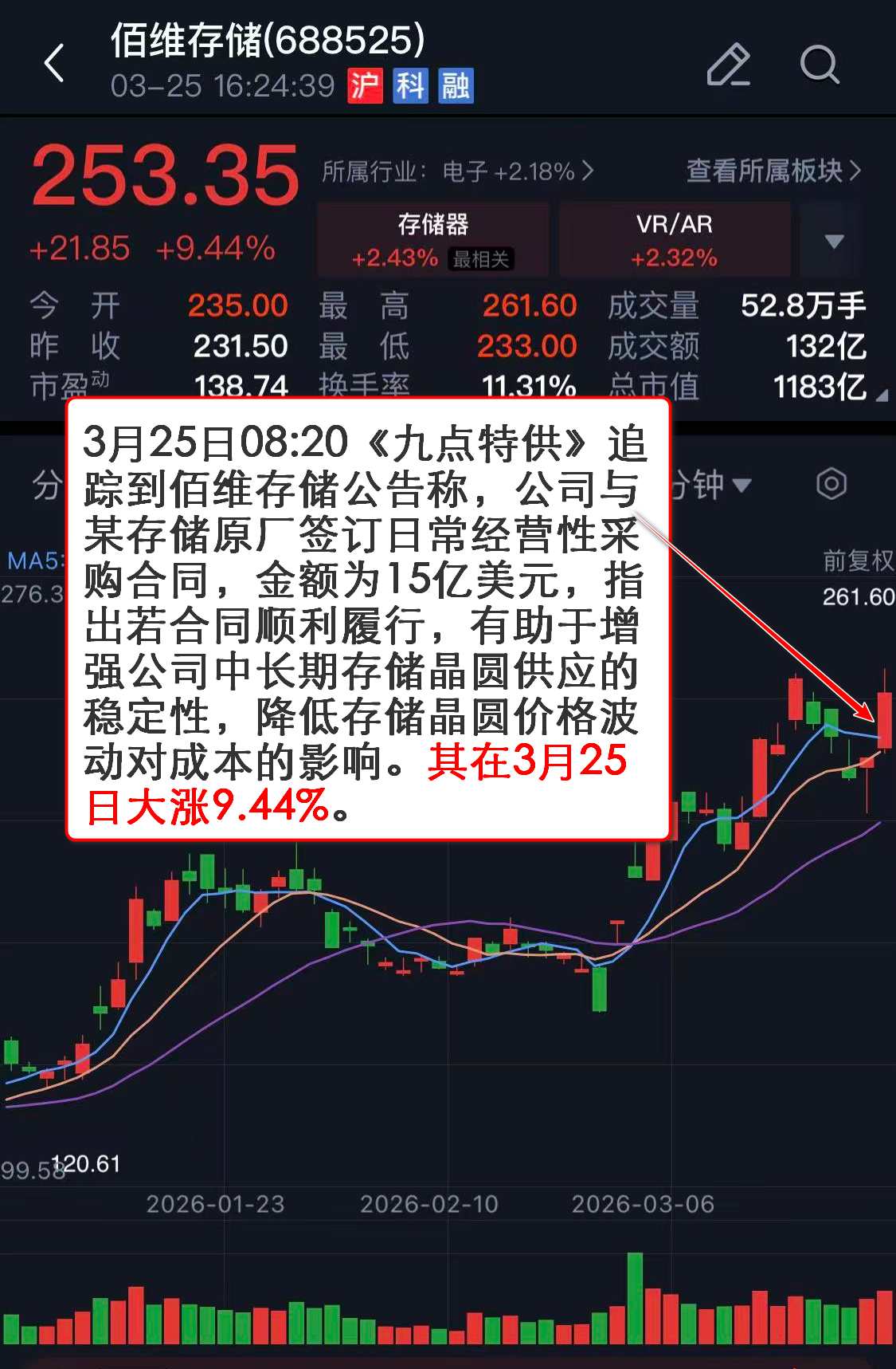 3月25日08:20《九点特供》追踪到佰维存储公告称,公司与某存储原厂签订日常经营性采购合同,金额为15亿美元,指出若合同顺利履行,有助于增强公司中长期存储晶圆供应的稳定性,降低存储晶圆价格波动对成本的影响。其在3月25日大涨9.44%。