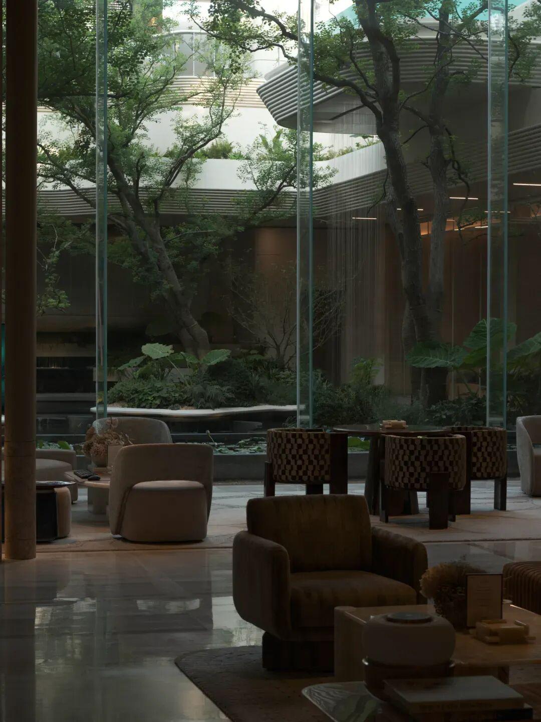 社区内5/8高层楼栋均有架空空间覆盖,共计约1700㎡,最高建筑层高约7.2米的架空空间以休闲下沉卡座、水吧台、休闲会客区打造,联动室外水池营造出酒店式度假空间,实现建筑与自然的无界融合。