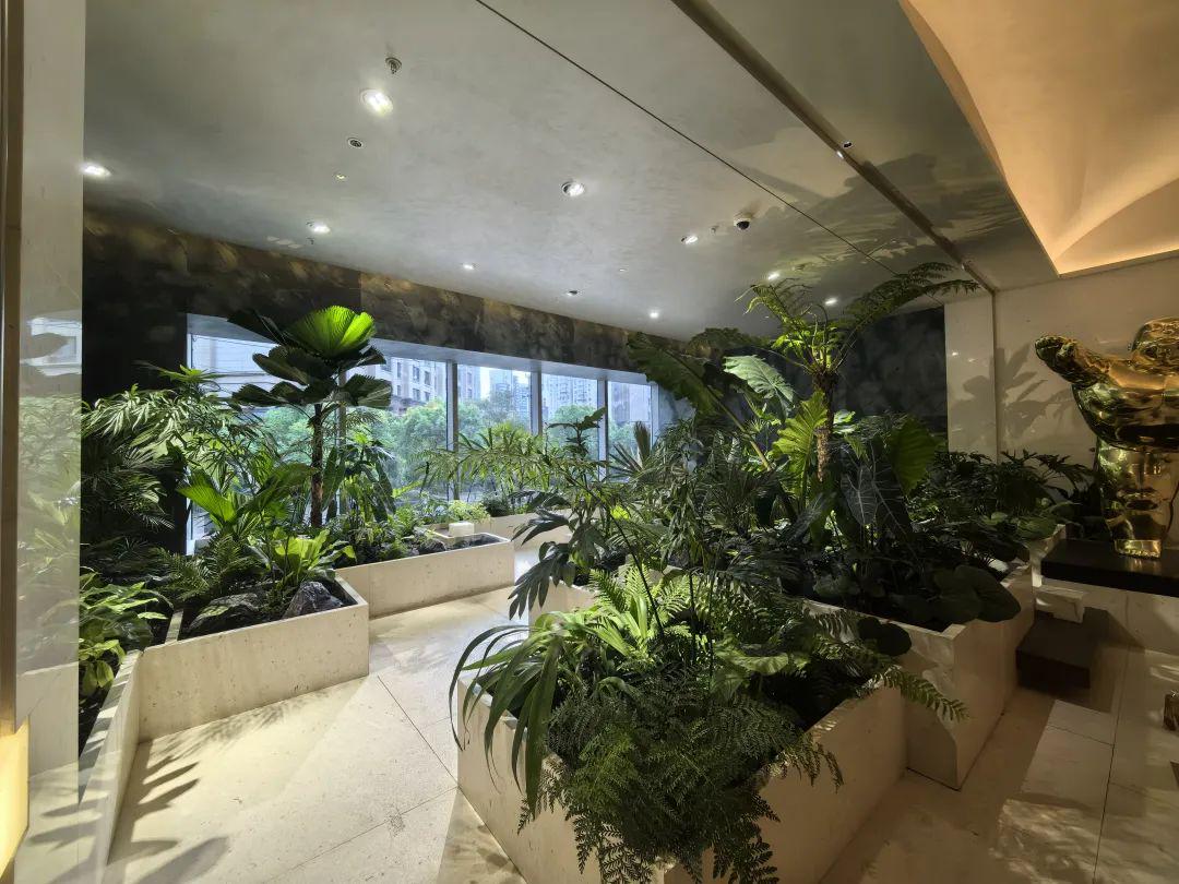 植物园泳池放在了2楼,选用了皮革面的绿色石材,营造一种树影斑驳的感觉。里面的绿植不是装饰,都是鲜活的、精心照养的。