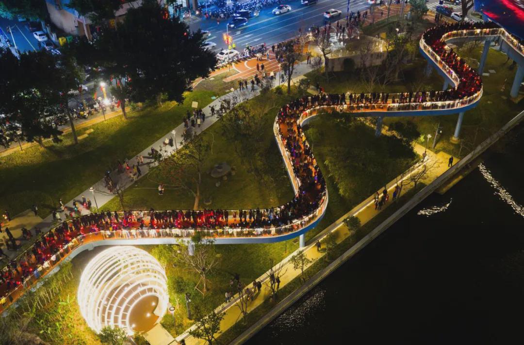 环形天桥作为关键纽带,牵引沿溪约3公里商贸圈的贯通与复苏。夜幕下,流光溢彩的天桥成为聚集人气的“磁极”,与沿岸龙廊等夜景交相辉映,构成绚丽的滨溪夜景长卷。沿线规划设置趣味便利店、驿站餐饮、文创零售、滨水集市、体验租赁、农旅融合项目、自动贩卖机等业态,探索出“以园养园”的可持续发展模式,推动生态、运动、商业、文旅深度融合。预计年运营收入可达285万元,日均人流量翻倍,群众满意度达99%。