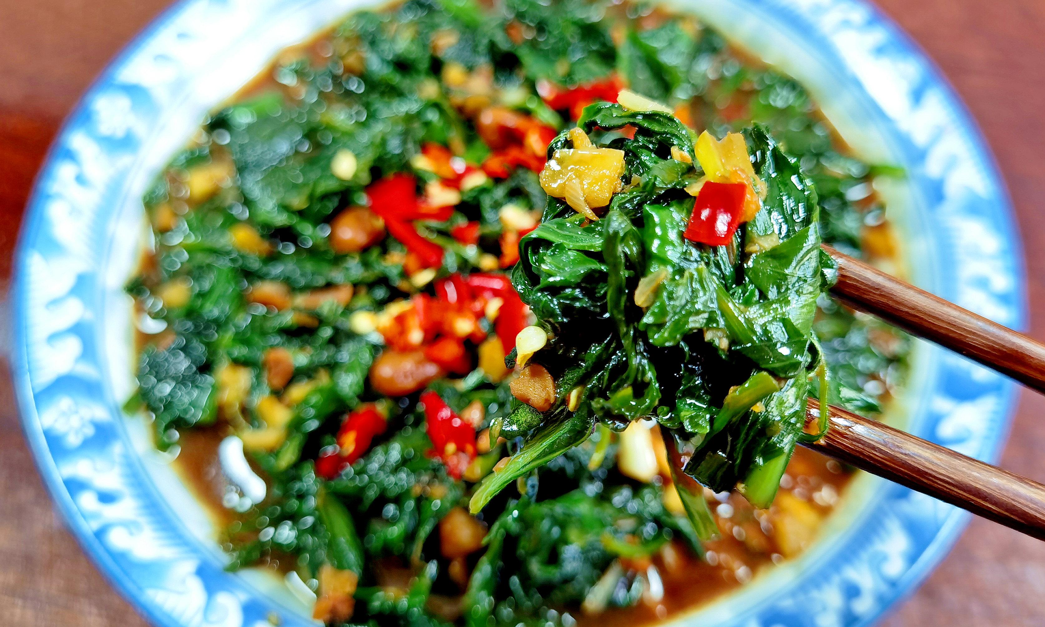 锅里倒油,多放点蒜末和小米辣爆香,然后把车前草倒进去大火快炒。沿着锅边淋一勺生抽,加一点点蚝油提鲜,翻炒几下就出锅。全程要快,火要大,这样炒出来的车前草脆嫩爽口,蒜香和辣味都进去了,酱香浓郁,配米饭能吃两大碗。