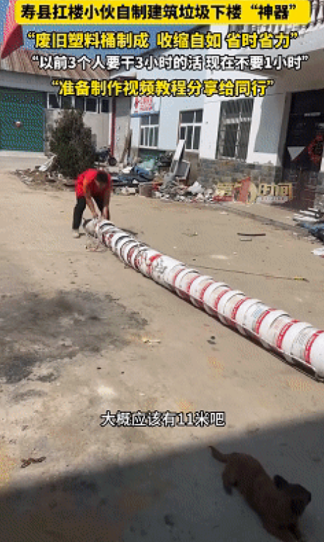 最绝的是,这玩意儿能伸缩。37个桶连起来,拉直了有11米长,从四楼直通地面绰绰有余。干完活往回一收,缩成2米8的一摞,往墙角一塞,不碍事不占地