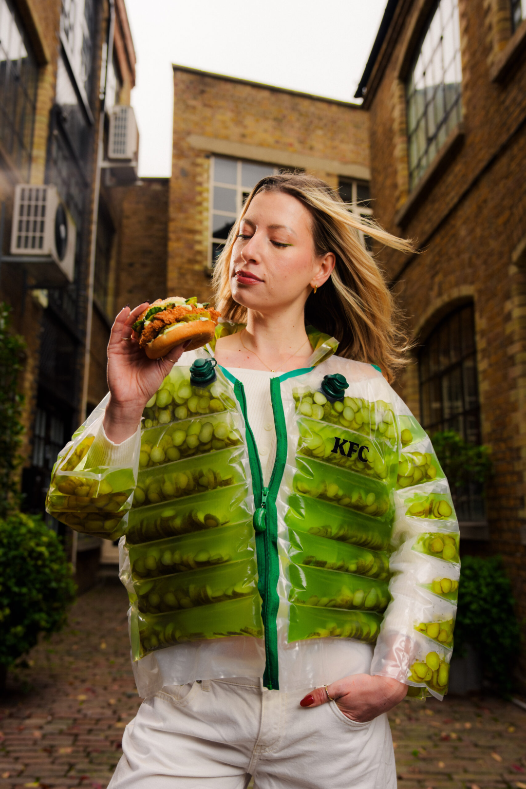 我知道把“酸黄瓜”和“羽绒服”两个词关联到一起很让人费解,但肯德基就这么不管不顾地做出来了: