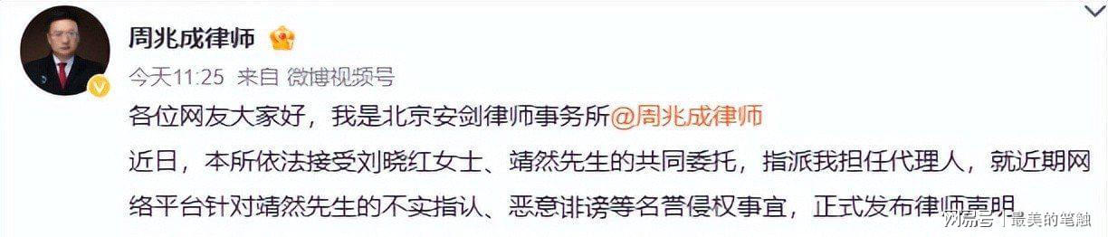 靖然和母亲刘晓红委托知名律师周兆成,发布了正式的律师声明,一条一条反驳刘晓庆的指控,态度特别强硬。