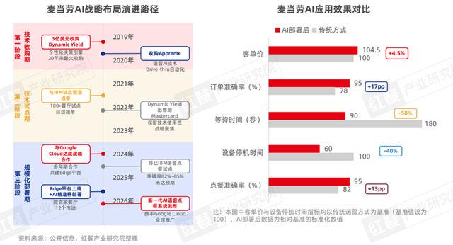例如,麦当劳是最早部署AI智能点餐的餐饮企业之一。在部署了AI点餐后,其客单价提升4.5%,订单与点餐准确率分别提升17、13个百分点,顾客等待时间、设备停机时间降幅达50%、40%,显著提升了经营效益与运营效率。