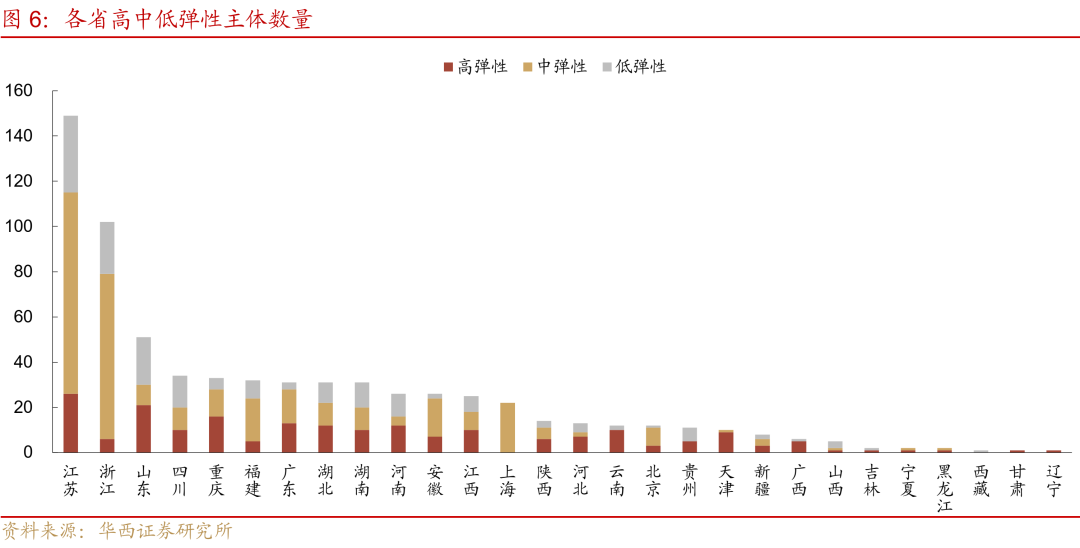 分省来看,江苏、山东和重庆高弹性主体数量较多,在15家以上,广东、湖北和河南在12-13家。若判断未来收益率将下行,可以优先投资高弹性主体,以赚取更多的超额收益。若判断未来收益率上行,则建议优先投资低弹性主体,更为抗跌。