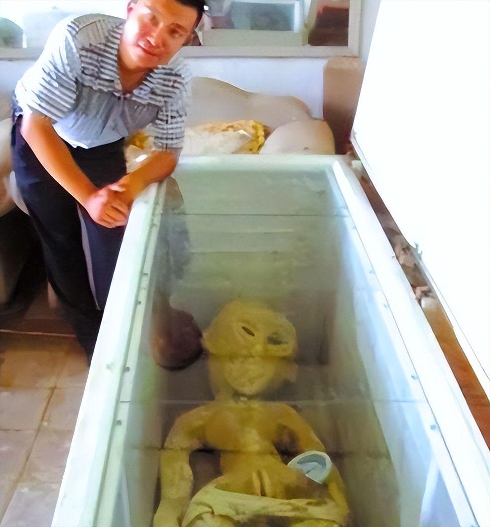 照片中,一具非人形躯体静卧于家用冰柜内:头颅硕大异常,双目深陷如墨穴,躯干纤细孱弱,表皮呈现均匀冷白色调,与银幕经典外星形象高度吻合。