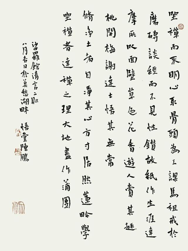 纵观陈鹏的艺术追求,“静定”是其修持之法,“清远”是其笔墨气象,“悟在平常”则是其抵达的精神境地。他的实践给予我们一种启示:在这个变幻莫测的时代,有价值的创造未必源于喧嚣的颠覆,而可能来自向内的沉潜与持续的深耕。当一个艺术探索者滤尽浮华,将全部生命热情投注于笔画的锤炼与艺术规律的省思时,他的作品便超越了技术的层面,成为其人格与境界的印证。他过往书法艺术的成果,已让我们艳羡!未来,他的孤往与深耕,正展翼于更开阔的天空。其未来的艺术旅程,值得我们期待。