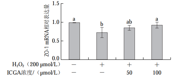 紧密连接是肠道屏障的核心结构,主要由跨膜蛋白Occludin、Claudins家族及外周膜蛋白ZO家族等共同构成。Occludin通过磷酸化控制ZO-1蛋白,进而调节紧密连接的稳定性和通透性,ZO蛋白充当桥梁,将Occludin和Claudin等连接蛋白连接到肌动蛋白细胞骨架,这些蛋白相互作用维持紧密连接的形成和功能。Caspase-3是细胞凋亡的关键执行者而Bcl-2是抗凋亡蛋白家族的核心成员。本实验中,经过H 2 O 2 诱导后,与对照组相比,模型组细胞中Claudin-1、ZO-1、Occludin和Bcl-2的mRNA相对表达量均显著降低,Caspase-3的mRNA相对表达量显著上升,这与Zhong Yajing等的报道一致,表明H 2 O 2 能够通过造成氧化应激破坏肠道形态的完整性,增加肠道通透性,影响肠道的正常功能。ICGA在幼畜日粮中添加可改善小肠绒毛形态结构,促进肠道Occludin和ZO-1基因的表达,增强肠道机械屏障功能。在对阿尔茨海默病的干预实验中发现ICGA-A可激活表皮生长因子受体/Ras/细胞外信号调节激酶信号通路,显著提高细胞活力,逆转损伤组促凋亡蛋白Caspase-3、Caspase-9和Bax的mRNA和蛋白水平升高的同时降低抗凋亡蛋白Bcl-2的mRNA和蛋白水平。本研究发现,细胞经过ICGA预处理后,能够显著缓解H 2 O 2 引起的Occludin和Claudin-3的mRNA相对表达量的下降,显著缓解Caspase-3的mRNA相对表达量的上升;其中100 μmol/L ICGA预处理组还能显著缓解ZO-1和Bcl-2的mRNA相对表达量下降,这可能与ICGA通过激活Nrf2抗氧化通路增强Bcl-2的转录和提高抗凋亡蛋白水平,同时通过抑制NF-κB信号通路减少促炎因子的释放,从而阻断Caspase-3上游激活信号,从而降低促凋亡蛋白Caspase-3的表达有关。