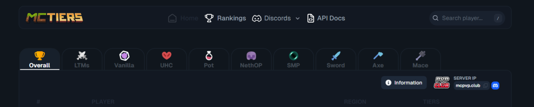 事先声明一点,MCTiers并不是官方组织,而是民间pvp玩家自发组建的游戏社区。因为该组织参与人数多、影响范围广、知名度大。因此一般很多人都会将该组织的排名直接当作评判依据。