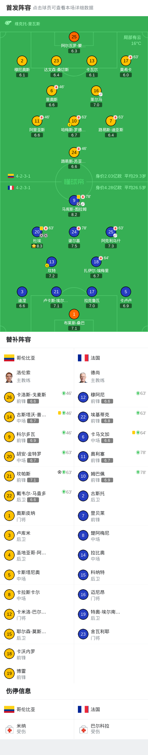 北京时间3月30日国际友谊赛,哥伦比亚对阵法国。哥伦比亚坎帕斯破门。法国杜埃梅开二度,马库斯-图拉姆破门。最终比分哥伦比亚 1-3 法国。