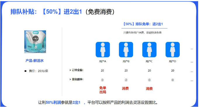 这一机制通常被称为“进2出1”或“排队补贴”。其运作原理并不复杂,却极具穿透力。当消费者在门店完成一笔消费(例如购买一袋8元的商品),这笔订单便会按时间顺序进入一个虚拟的“排队序列”。系统会将这笔消费产生的部分利润(例如50%)提取出来,注入一个共享的“补贴资金池”。这个池子里的钱,不会凭空消失,而是被严格定义为“前置消费者的返利基金”。简单来说,今天你消费产生的利润,被用来补贴排在你前面的消费者;而当你前面的消费者获得足额补贴“出局”后,你的位置就会前移,由后面新进来的消费者为你贡献补贴。