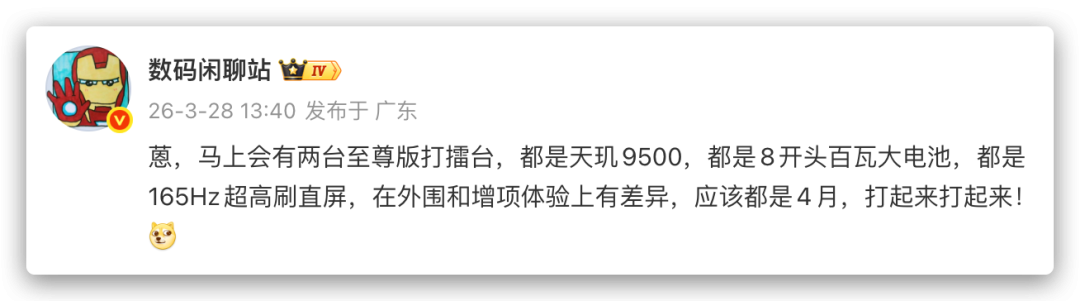 紧接着,知名博主熊猫很禿然发帖:“ Ace6至尊版准确电池是8500毫安时,165hz刷新率+D9500处理器! ”