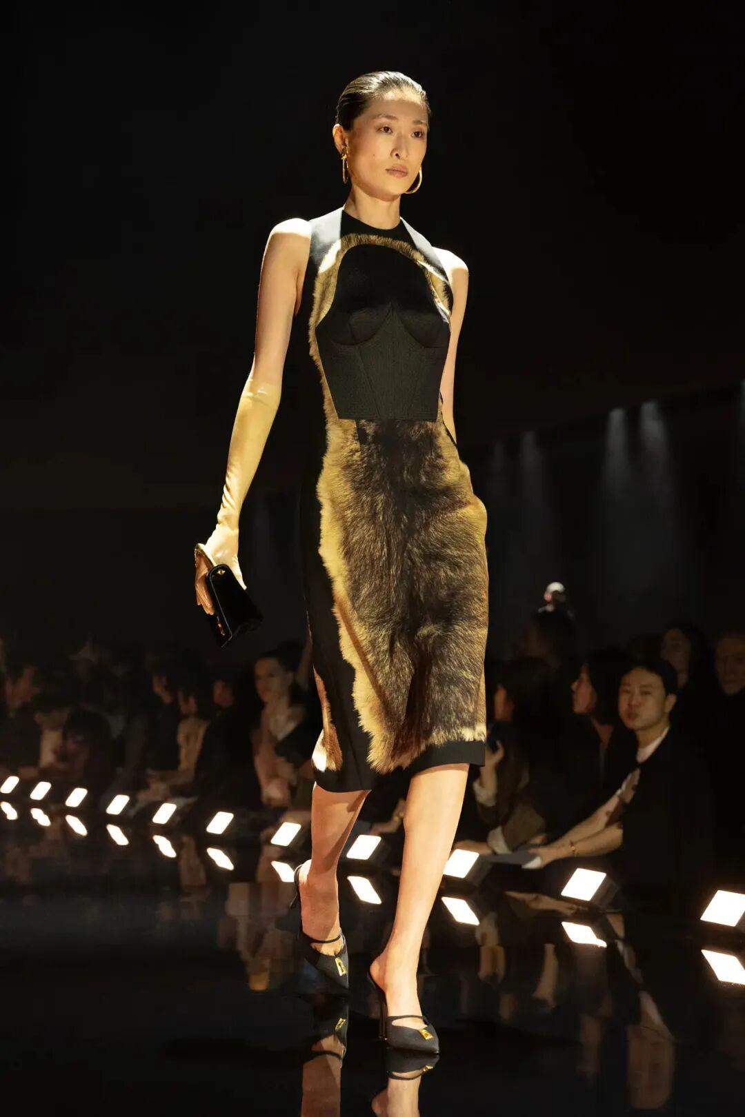 野性印记:系列中遍布毛茸茸的皮草印花、手绘的鳄鱼鳞纹,以及由填充袜筒制成的、带有眨眼图案的裙装,致敬了艺术家莎拉·卢卡斯的风格,并通过肩、胸、臀部的填充处理,重塑身体轮廓。