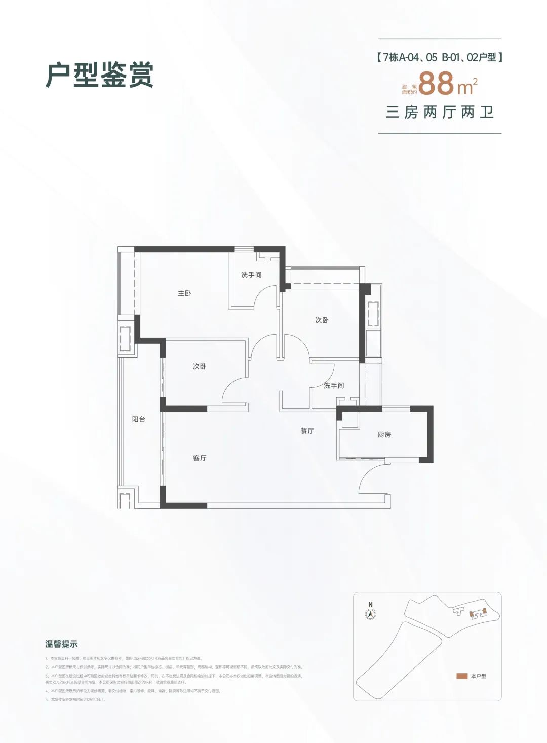88㎡的3房2厅2卫,设计的是经典竖厅格局,进门入户玄关,LDKB一体化设计,动静分区,客厅连接次卧出大阳台,L型厨房,公卫三段式分离,得房率约82%(不含赠送),西南或东北朝向。