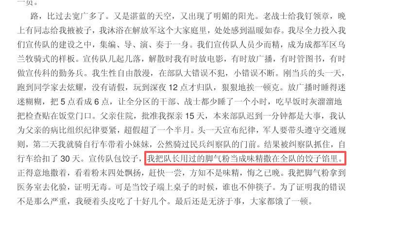部队包饺子时,刘晓庆把队长的脚气粉当成了味精。