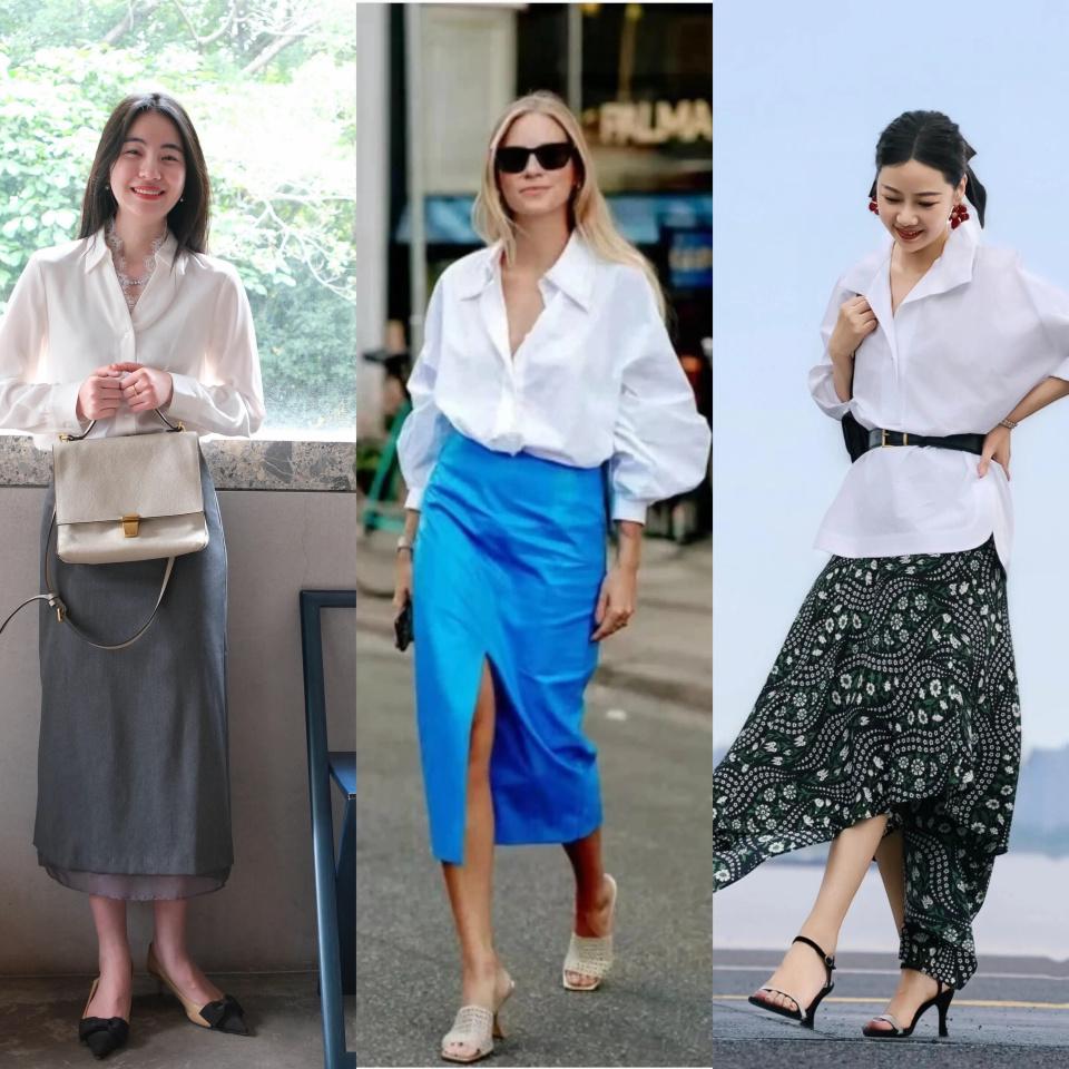 身穿一条直筒半裙可以让身材线条更流畅,上衣可用微宽松白衬衫来穿搭,穿时把衬衫衣角塞进裙子里,形成高腰线,能够使得穿搭者拥有三七分身材。
