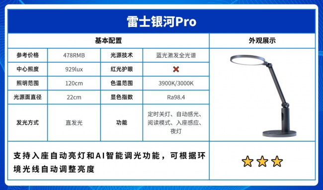 什么护眼台灯比较专业?雷士银河Pro护眼台灯的基础照明表现达标,22cm圆形灯面搭配929lux中心照度,符合国AA级标准,日常单人学习、读写的亮度需求可以满足。功能上有不少实用的智能设计,入座就能自动亮灯,AI智能调光还能跟着环境光线自动调整亮度。但直发光的设计让光线过于集中,使用时容易出现轻微眩光,长时间盯着看眼睛容易发酸。