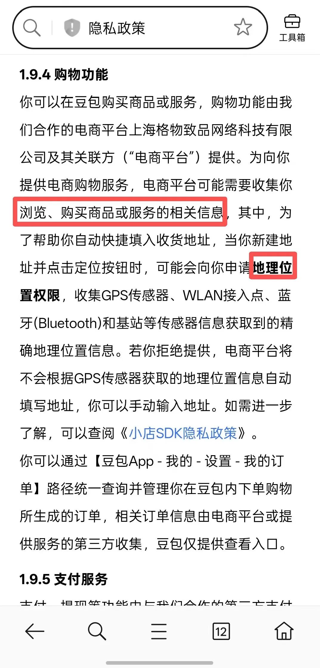 为向你提供电商购物服务,电商平台可能需要收集你浏览、购买商品或服务的相关信息,其中,为了帮助你自动快捷填入收货地址,当你新建地址并点击定位按钮时,可能会向你申请地理位置权限,收集GPS传感器、WLAN接入点、蓝牙(Bluetooth)和基站等传感器信息获取到的精确地理位置信息。若你拒绝提供,电商平台将不会根据GPS传感器获取的地理位置信息自动填写地址,你可以手动输入地址。如需进一步了解,可以查阅《小店SDK隐私政策》。