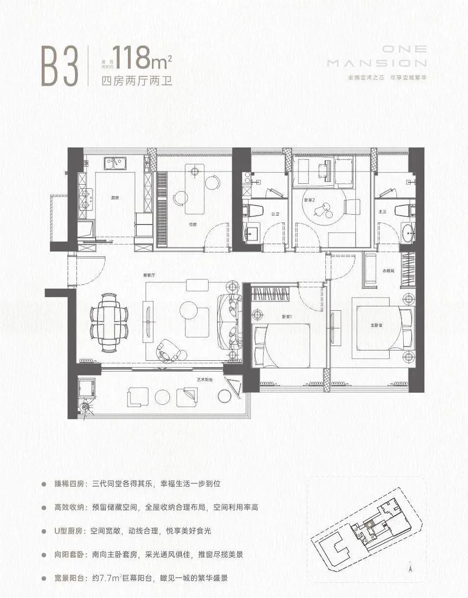 118㎡的4房2厅2卫,设计的横厅南北通透格局,全屋飘窗设计,三开间朝南,U型厨房,约7.7米长超大阳台,得房率72.47%(不含赠送),阳台主朝东南朝向。