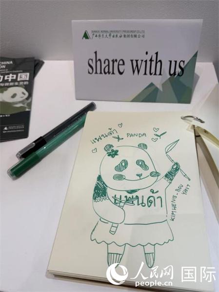 图片展现场的观众留言册上,海外民众积极评论打卡并画下了生动活泼的熊猫手绘。 人民网记者 张矜若摄
