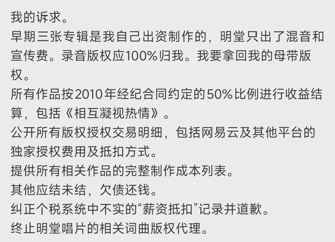 “现在我正式要求明堂唱片就《27: the code of lucifer》专辑合作以来涉及的收益情况进行全面核对,并向我该专辑历年全部收益明细”