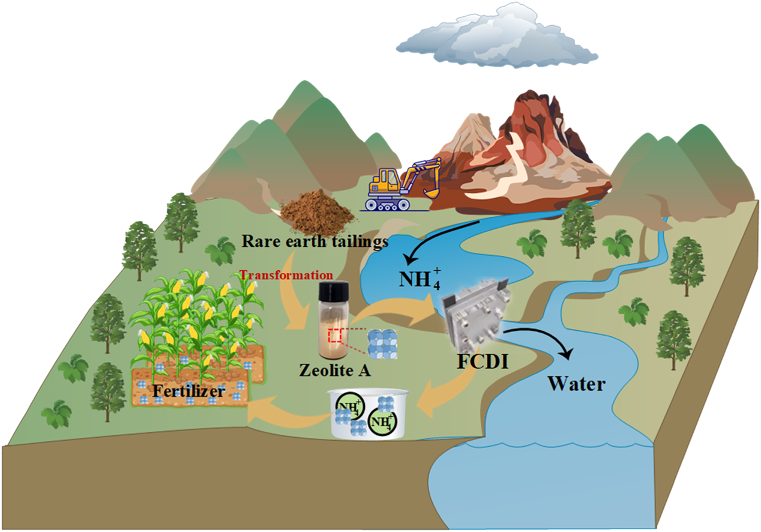 近日,南昌大学谢显传课题组在Water Research(中科院一区,影响因子12.4)发表了题为“Rare earth-derived conductive zeolite electrodes empower NH₄⁺ recovery from mining wastewater via FCDI and their application as ammonia release fertilizer”的研究论文(DOI: 10.1016/j.watres.2026.125581),稀土开采过程中会产生大量尾矿和高氨氮废水,既是环境隐患,也是资源浪费。针对这一难题,该研究首次以稀土尾矿为原料,通过高温煅烧和水热反应,成功制备出导电沸石材料,并将其作为流动电极电容去离子技术(FCDI)的电极材料,成功实现稀土矿山废水中铵根离子(NH₄⁺)的高效去除、回收及资源化利用,构建了矿业 “尾矿利用 - 废水修复 - 农业应用” 的闭环循环经济模式,为稀土行业绿色可持续发展提供了全新解决方案。