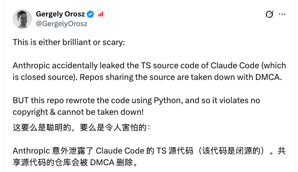 DMCA 保护的只是 Claude 的代码本体,可并不会保护大家对 Claude Code 的二次创作。
