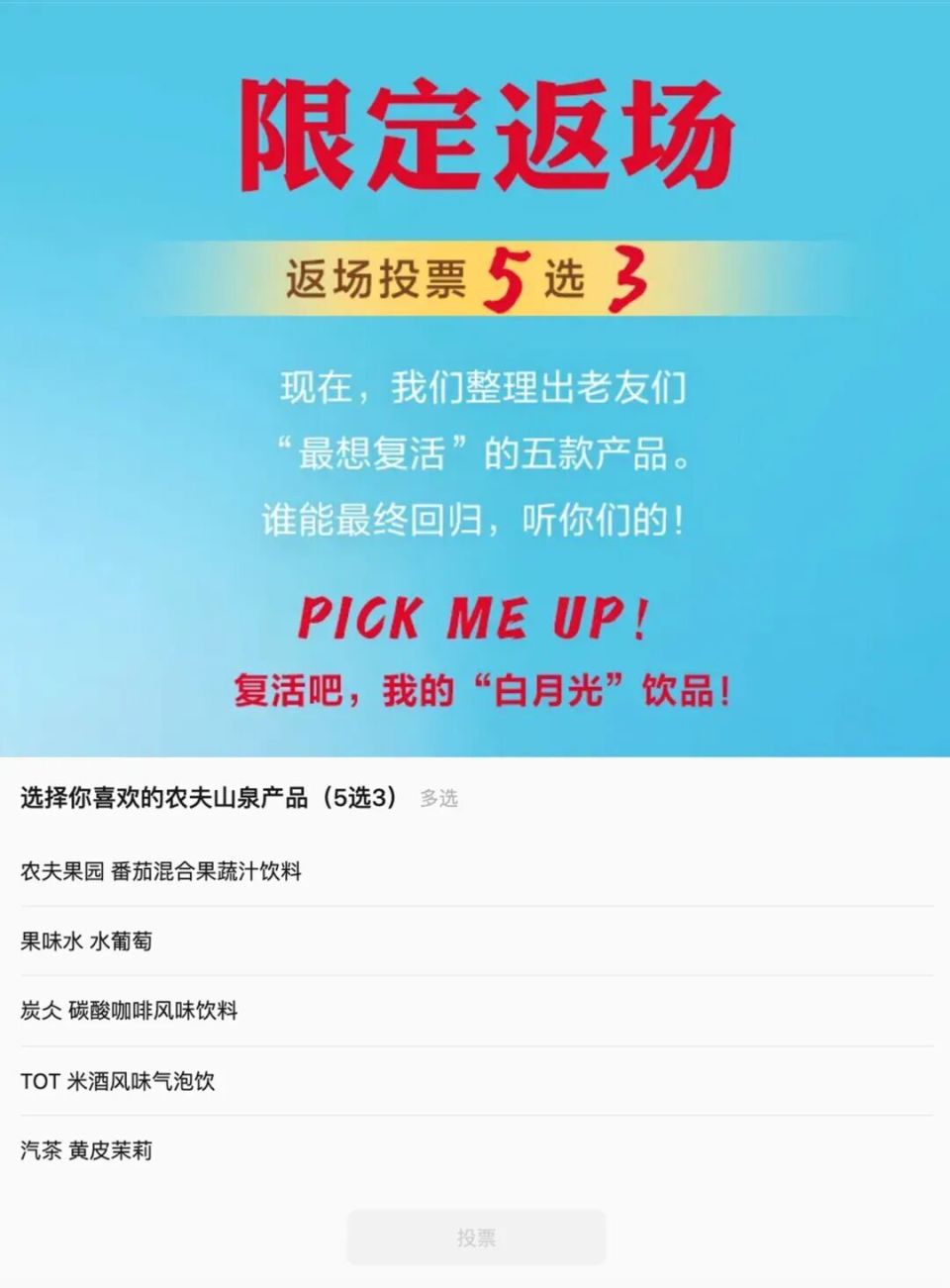 它不光是表示复活茄门,甚至根据后台反馈,把很多下了架的饮料也搞上复活赛了,五个饮料,票数前三名的能再次出道。