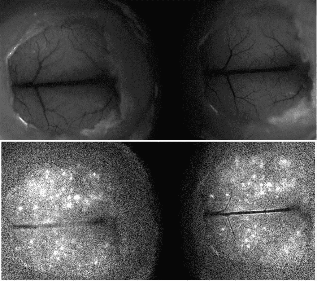 图1:使用Kinetix sCMOS相机拍摄的多块神经元组织图像。上图显示了组织内的结构细节和血管,下图是视频的静止帧,使用COSMOS技术高速成像功能神经活动。