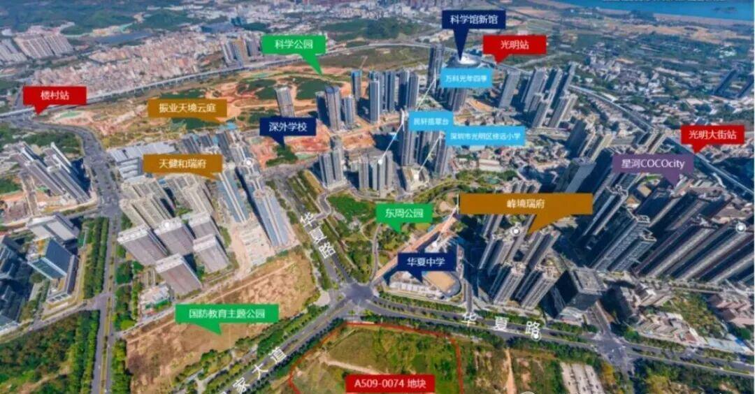 振业天境云庭,位于深圳光明中心区核心腹地,华夏路与周家大道交汇处,紧邻华夏中学,坐拥科学公园绿轴景观。项目所在区域原为工业用地,经规划调整后转型为低密度居住区,容积率仅3.1,远低于周边竞品。北侧为东周文化公园、国防教育主题公园及木墩村公园,东侧紧邻东周小学等优质教育资源,西侧与南侧为待开发空地,保证了开阔的景观视野和低密度居住体验。项目处于光明科学城规划的"产业转化区"与"生活服务中心"交汇处,直接受益于科学城人才导入和区域价值提升。