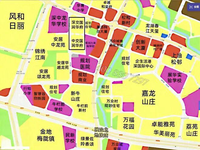 1、首先从区位来看,中交国润华府所处的龙华民治老中心区板块,周边是大家熟知的风和日丽,锦绣江南这些楼盘,西北侧是壹城中心,西南侧邻居民治跟红山板块,区位是比较不错的,在龙华而言也算是第二梯队的板块。