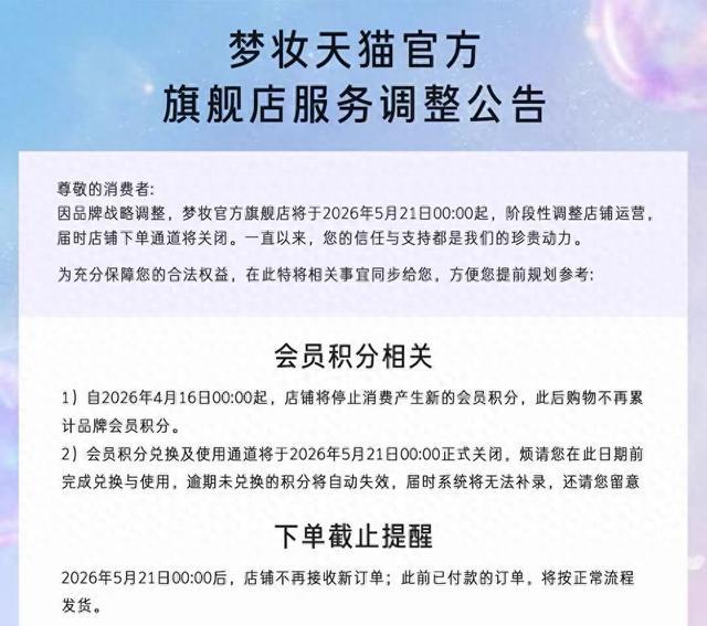 与之同时,梦妆还宣布,在中国的线上官方销售渠道(如官方商城、电商平台旗舰店)将服务至2026年6月30日正式关闭。