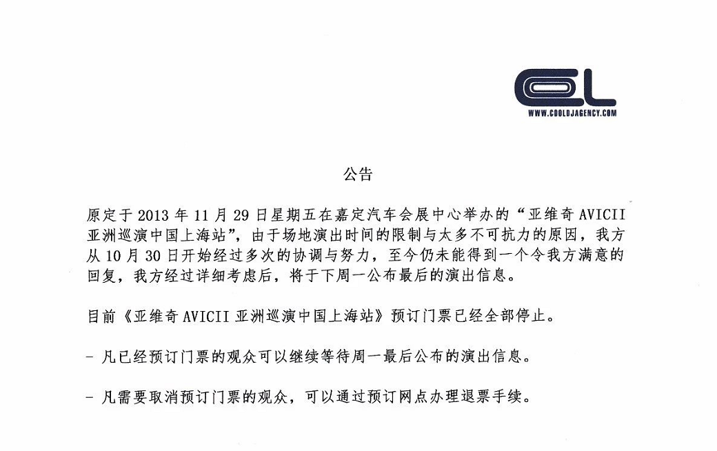 成功的前提下会是Avicii第五次在中国演出(含港澳台),但是不太成功。Avicii《True Tour》2013年巡演原定是有上海站的,具体日期为2013年11月29日,但因为原定的场地“上海汽车会展中心”出了一些幺蛾子,场地无法再正常使用,而Avicii团队不接受将场地更换为夜店,所以这场演出就取消了。其实如果不是更换为夜店,那时他会来。